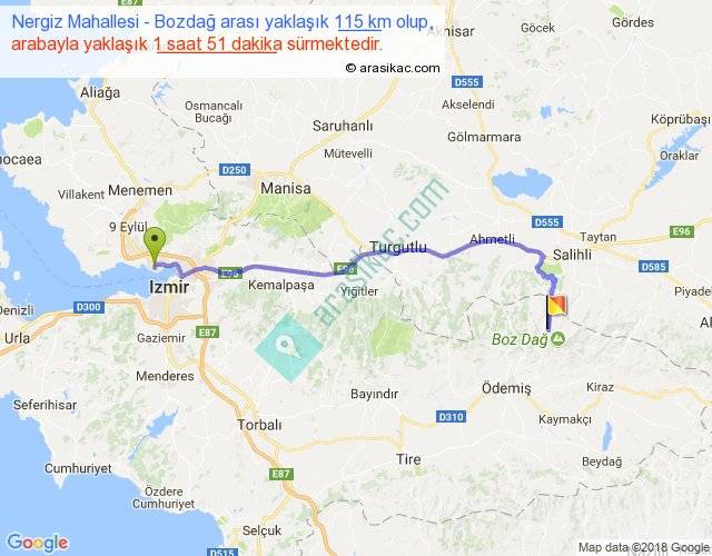 Nergiz Mahallesi - Bozdağ arası yaklaşık olarak 90 km/h ile yukarıda belirtilen sürede olup, iki yerin kuş uçuşu uzaklığı (mesafesi) 85'dir. Yolculuk otobüsle 2 saat 24 dakika sürmektedir.
