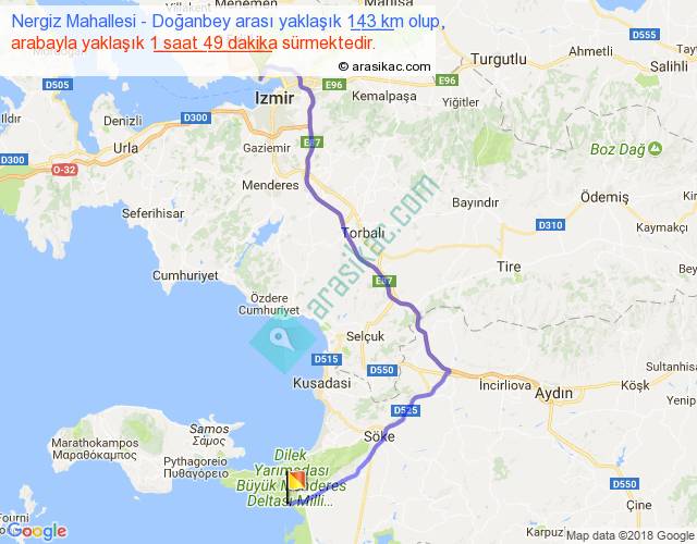 Nergiz Mahallesi - Doğanbey arası yaklaşık olarak 90 km/h ile yukarıda belirtilen sürede olup, iki yerin kuş uçuşu uzaklığı (mesafesi) 94'dir. Yolculuk otobüsle 2 saat 21 dakika sürmektedir.