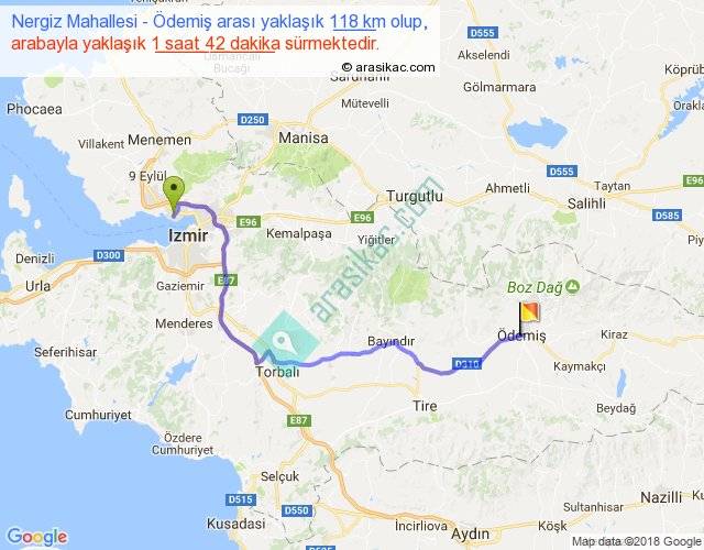 Nergiz Mahallesi - Ödemiş arası yaklaşık olarak 90 km/h ile yukarıda belirtilen sürede olup, iki yerin kuş uçuşu uzaklığı (mesafesi) 80'dir. Yolculuk otobüsle 2 saat 12 dakika sürmektedir.