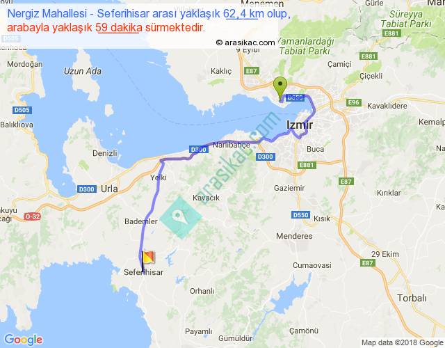 Nergiz Mahallesi - Seferihisar arası yaklaşık olarak 90 km/h ile yukarıda belirtilen sürede olup, iki yerin kuş uçuşu uzaklığı (mesafesi) 37'dir. Yolculuk otobüsle 1 saat 16 dakika sürmektedir.