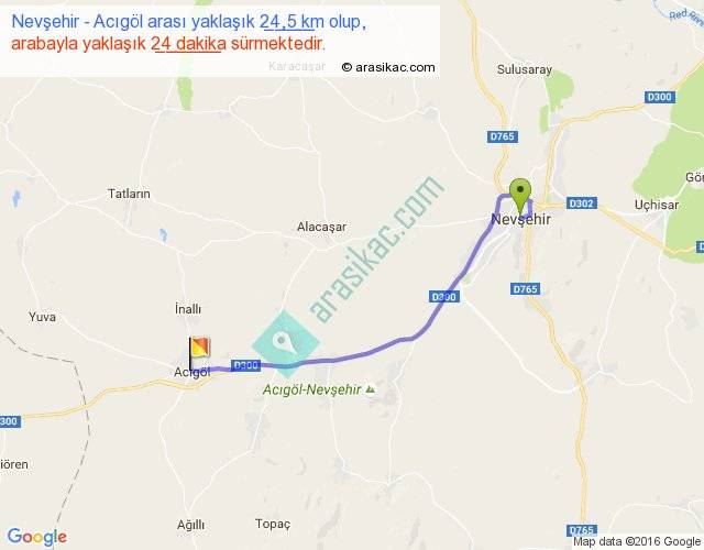Nevşehir - Acıgöl arası yaklaşık olarak 90 km/h ile yukarıda belirtilen sürede olup, iki yerin kuş uçuşu uzaklığı (mesafesi) 20'dir. Yolculuk otobüsle 31 dakika sürmektedir.