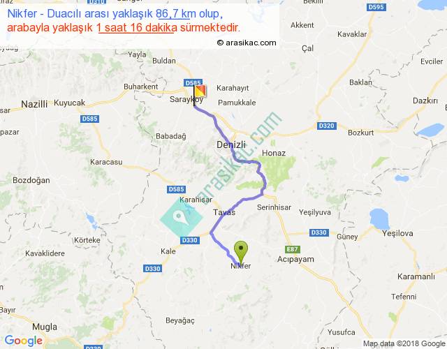 Nikfer - Duacılı arası yaklaşık olarak 90 km/h ile yukarıda belirtilen sürede olup, iki yerin kuş uçuşu uzaklığı (mesafesi) 57'dir. Yolculuk otobüsle 1 saat 38 dakika sürmektedir.