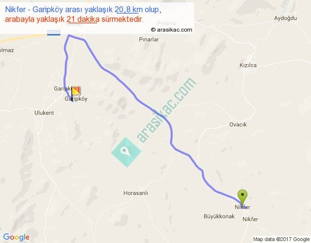 Nikfer - Garipköy arası yaklaşık olarak 90 km/h ile yukarıda belirtilen sürede olup, iki yerin kuş uçuşu uzaklığı (mesafesi) 12'dir. Yolculuk otobüsle 27 dakika sürmektedir.