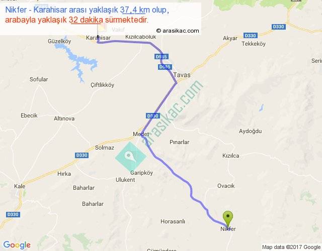 Nikfer - Karahisar arası yaklaşık olarak 90 km/h ile yukarıda belirtilen sürede olup, iki yerin kuş uçuşu uzaklığı (mesafesi) 28'dir. Yolculuk otobüsle 41 dakika sürmektedir.