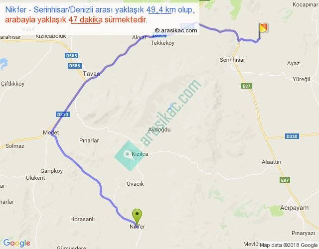 Nikfer - Serinhisar Denizli arası yaklaşık olarak 90 km/h ile yukarıda belirtilen sürede olup, iki yerin kuş uçuşu uzaklığı (mesafesi) 27'dir. Yolculuk otobüsle 1 saat 1 dakika sürmektedir.