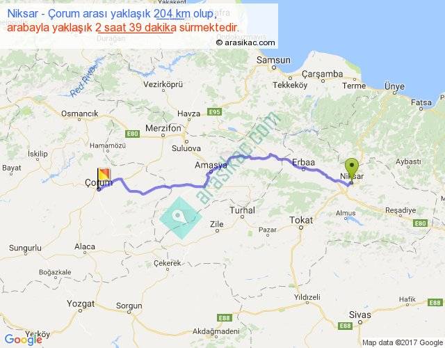Niksar - Çorum arası yaklaşık olarak 90 km/h ile yukarıda belirtilen sürede olup, iki yerin kuş uçuşu uzaklığı (mesafesi) 168'dir. Yolculuk otobüsle 3 saat 26 dakika sürmektedir.