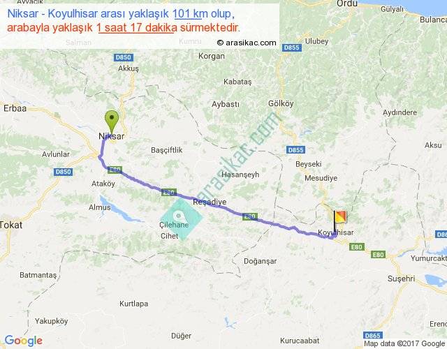 Niksar - Koyulhisar arası yaklaşık olarak 90 km/h ile yukarıda belirtilen sürede olup, iki yerin kuş uçuşu uzaklığı (mesafesi) 81'dir. Yolculuk otobüsle 1 saat 40 dakika sürmektedir.