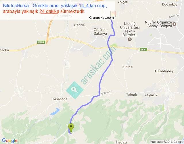 Nilüfer Bursa - Görükle arası yaklaşık olarak 90 km/h ile yukarıda belirtilen sürede olup, iki yerin kuş uçuşu uzaklığı (mesafesi) 12'dir. Yolculuk otobüsle 31 dakika sürmektedir.