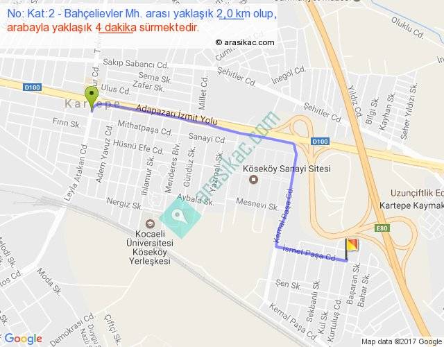 No: Kat:2 - Bahçelievler Mh. arası yaklaşık olarak 90 km/h ile yukarıda belirtilen sürede olup, iki yerin kuş uçuşu uzaklığı (mesafesi) 2'dir. Yolculuk otobüsle 5 dakika sürmektedir.