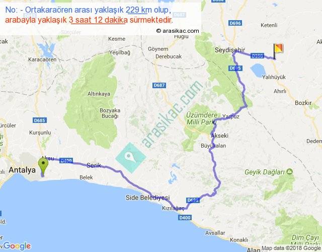 No: - Ortakaraören arası yaklaşık olarak 90 km/h ile yukarıda belirtilen sürede olup, iki yerin kuş uçuşu uzaklığı (mesafesi) 125'dir. Yolculuk otobüsle 4 saat 9 dakika sürmektedir.