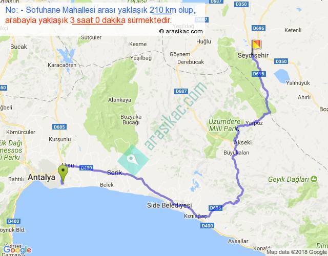 No: - Sofuhane Mahallesi arası yaklaşık olarak 90 km/h ile yukarıda belirtilen sürede olup, iki yerin kuş uçuşu uzaklığı (mesafesi) 108'dir. Yolculuk otobüsle 3 saat 54 dakika sürmektedir.