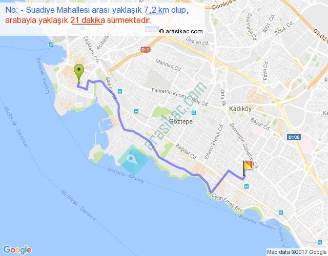 No: - Suadiye Mahallesi arası yaklaşık olarak 90 km/h ile yukarıda belirtilen sürede olup, iki yerin kuş uçuşu uzaklığı (mesafesi) 5'dir. Yolculuk otobüsle 27 dakika sürmektedir.