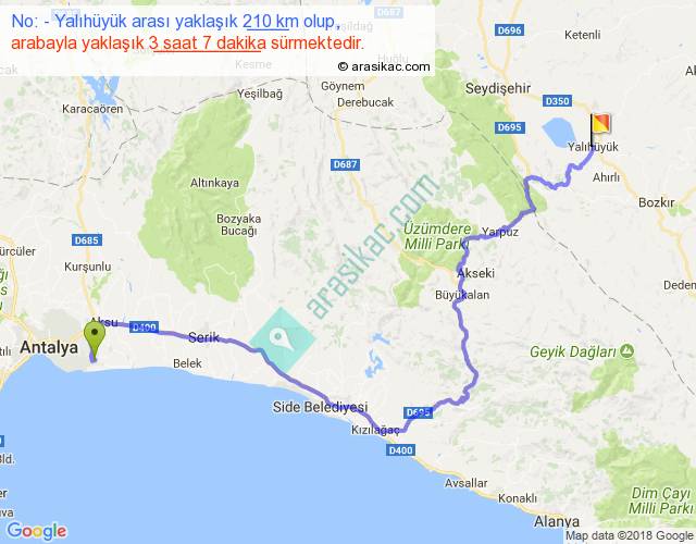 No: - Yalıhüyük arası yaklaşık olarak 90 km/h ile yukarıda belirtilen sürede olup, iki yerin kuş uçuşu uzaklığı (mesafesi) 121'dir. Yolculuk otobüsle 4 saat 3 dakika sürmektedir.