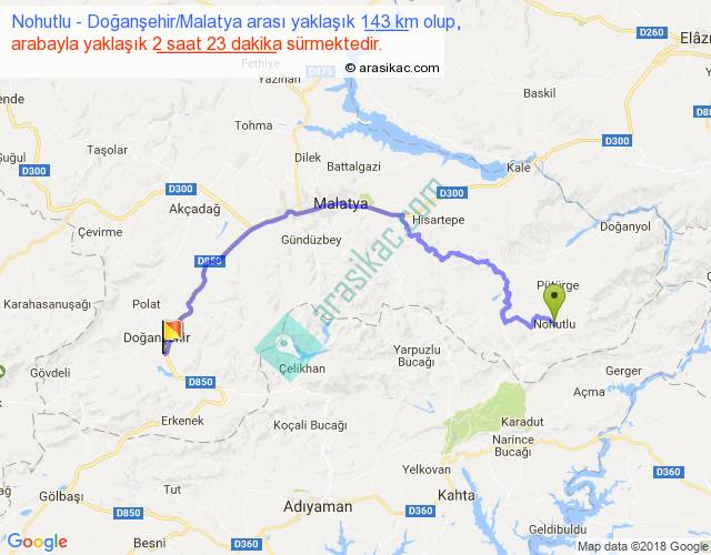 Nohutlu - Doğanşehir Malatya arası yaklaşık olarak 90 km/h ile yukarıda belirtilen sürede olup, iki yerin kuş uçuşu uzaklığı (mesafesi) 84'dir. Yolculuk otobüsle 3 saat 5 dakika sürmektedir.