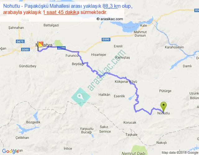 Nohutlu - Paşaköşkü Mahallesi arası yaklaşık olarak 90 km/h ile yukarıda belirtilen sürede olup, iki yerin kuş uçuşu uzaklığı (mesafesi) 54'dir. Yolculuk otobüsle 2 saat 16 dakika sürmektedir.