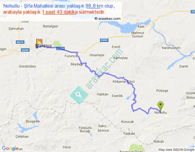 Nohutlu - Şifa Mahallesi arası yaklaşık olarak 90 km/h ile yukarıda belirtilen sürede olup, iki yerin kuş uçuşu uzaklığı (mesafesi) 54'dir. Yolculuk otobüsle 2 saat 13 dakika sürmektedir.