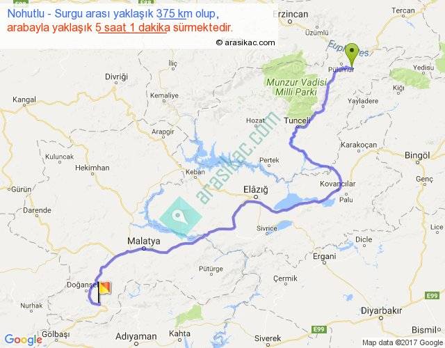 Nohutlu - Surgu arası yaklaşık olarak 90 km/h ile yukarıda belirtilen sürede olup, iki yerin kuş uçuşu uzaklığı (mesafesi) 235'dir. Yolculuk otobüsle 6 saat 31 dakika sürmektedir.