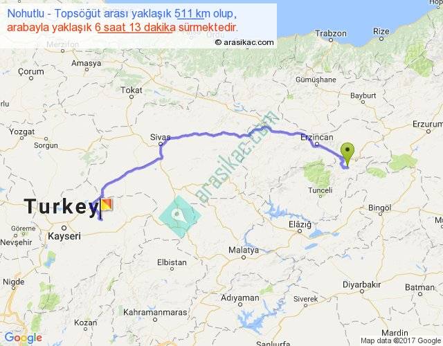 Nohutlu - Topsöğüt arası yaklaşık olarak 90 km/h ile yukarıda belirtilen sürede olup, iki yerin kuş uçuşu uzaklığı (mesafesi) 342'dir. Eğer belirtilen yerler arasında uçak seferi var ise bu süre uçakla 31 dakika'ya kadar düşebilir. Yolculuk otobüsle 8 saat 4 dakika sürmektedir.
