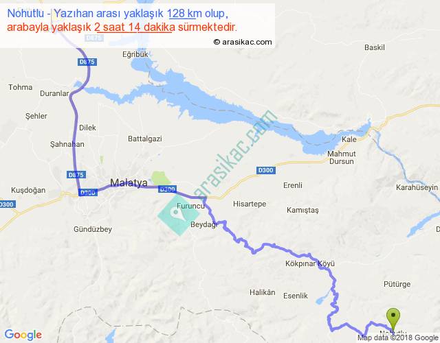Nohutlu - Yazıhan arası yaklaşık olarak 90 km/h ile yukarıda belirtilen sürede olup, iki yerin kuş uçuşu uzaklığı (mesafesi) 79'dir. Yolculuk otobüsle 2 saat 54 dakika sürmektedir.