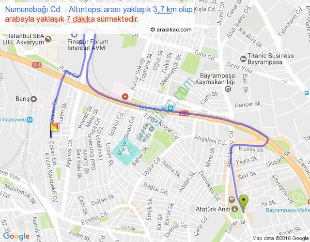 Numunebağı Cd. - Altıntepsi arası yaklaşık olarak 90 km/h ile yukarıda belirtilen sürede olup, iki yerin kuş uçuşu uzaklığı (mesafesi) 2'dir. Yolculuk otobüsle 9 dakika sürmektedir.