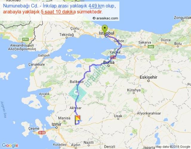 Numunebağı Cd. - İnkılap arası yaklaşık olarak 90 km/h ile yukarıda belirtilen sürede olup, iki yerin kuş uçuşu uzaklığı (mesafesi) 293'dir. Eğer belirtilen yerler arasında uçak seferi var ise bu süre uçakla 27 dakika'ya kadar düşebilir. Yolculuk otobüsle 6 saat 43 dakika sürmektedir.