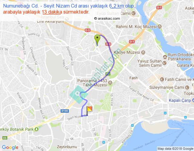 Numunebağı Cd. - Seyit Nizam Cd arası yaklaşık olarak 90 km/h ile yukarıda belirtilen sürede olup, iki yerin kuş uçuşu uzaklığı (mesafesi) 3'dir. Yolculuk otobüsle 16 dakika sürmektedir.
