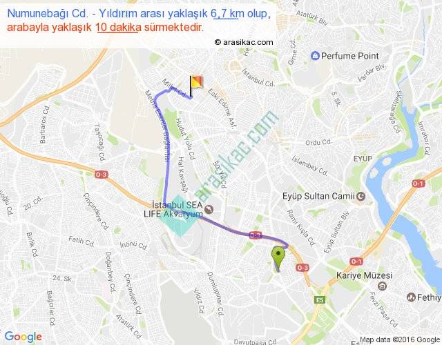 Numunebağı Cd. - Yıldırım arası yaklaşık olarak 90 km/h ile yukarıda belirtilen sürede olup, iki yerin kuş uçuşu uzaklığı (mesafesi) 4'dir. Yolculuk otobüsle 13 dakika sürmektedir.