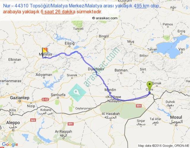 Nur - 44310 Topsöğüt Malatya Merkez Malatya arası yaklaşık olarak 90 km/h ile yukarıda belirtilen sürede olup, iki yerin kuş uçuşu uzaklığı (mesafesi) 364'dir. Eğer belirtilen yerler arasında uçak seferi var ise bu süre uçakla 33 dakika'ya kadar düşebilir. Yolculuk otobüsle 8 saat 21 dakika sürmektedir.