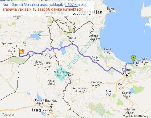 Nur - Girmeli Mahallesi arası yaklaşık olarak 90 km/h ile yukarıda belirtilen sürede olup, iki yerin kuş uçuşu uzaklığı (mesafesi) 940'dir. Eğer belirtilen yerler arasında uçak seferi var ise bu süre uçakla 1 saat 26 dakika'ya kadar düşebilir. Yolculuk otobüsle 1 gün 0 saat sürmektedir.