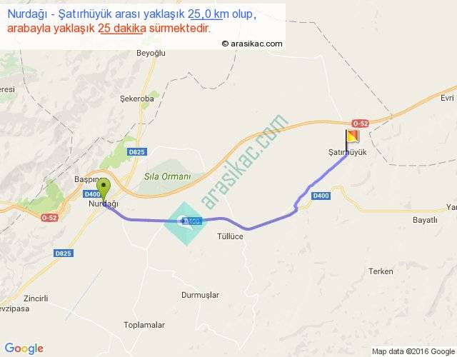 Nurdağı - Şatırhüyük arası yaklaşık olarak 90 km/h ile yukarıda belirtilen sürede olup, iki yerin kuş uçuşu uzaklığı (mesafesi) 21'dir. Yolculuk otobüsle 32 dakika sürmektedir.