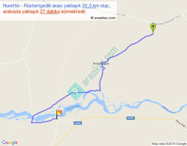Nurettin - Rüstemgedik arası yaklaşık olarak 90 km/h ile yukarıda belirtilen sürede olup, iki yerin kuş uçuşu uzaklığı (mesafesi) 13'dir. Yolculuk otobüsle 35 dakika sürmektedir.
