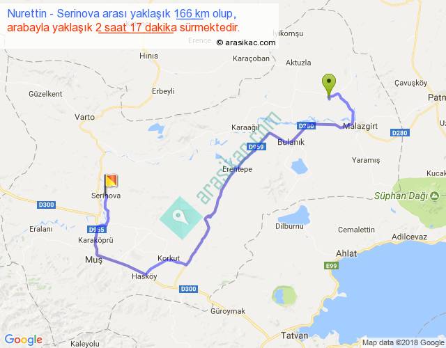 Nurettin - Serinova arası yaklaşık olarak 90 km/h ile yukarıda belirtilen sürede olup, iki yerin kuş uçuşu uzaklığı (mesafesi) 82'dir. Yolculuk otobüsle 2 saat 58 dakika sürmektedir.