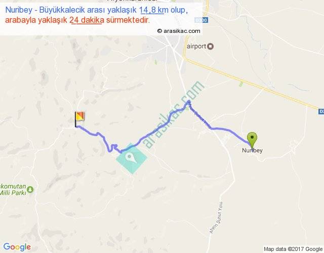 Nuribey - Büyükkalecik arası yaklaşık olarak 90 km/h ile yukarıda belirtilen sürede olup, iki yerin kuş uçuşu uzaklığı (mesafesi) 10'dir. Yolculuk otobüsle 31 dakika sürmektedir.