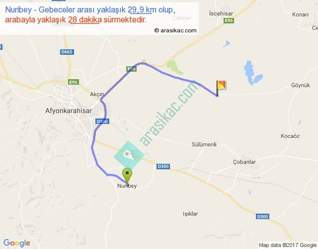 Nuribey - Gebeceler arası yaklaşık olarak 90 km/h ile yukarıda belirtilen sürede olup, iki yerin kuş uçuşu uzaklığı (mesafesi) 15'dir. Yolculuk otobüsle 36 dakika sürmektedir.