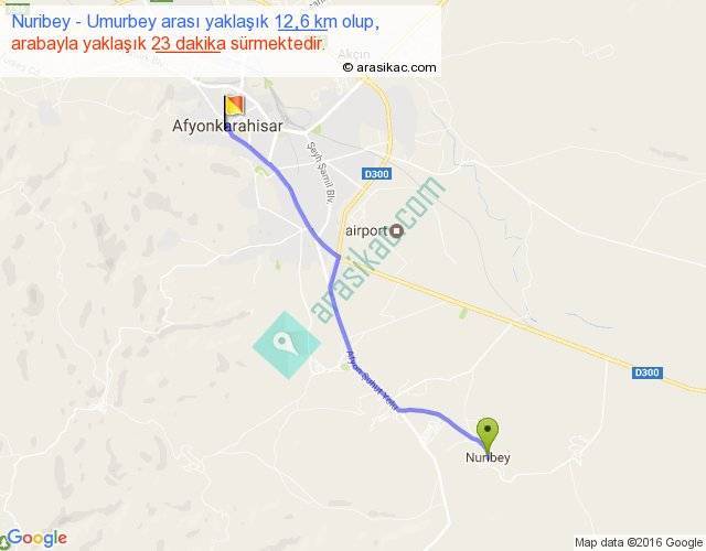 Nuribey - Umurbey arası yaklaşık olarak 90 km/h ile yukarıda belirtilen sürede olup, iki yerin kuş uçuşu uzaklığı (mesafesi) 11'dir. Yolculuk otobüsle 29 dakika sürmektedir.