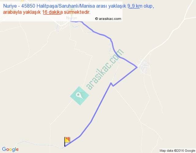 Nuriye - 45850 Halitpaşa Saruhanlı Manisa arası yaklaşık olarak 90 km/h ile yukarıda belirtilen sürede olup, iki yerin kuş uçuşu uzaklığı (mesafesi) 6'dir. Yolculuk otobüsle 20 dakika sürmektedir.