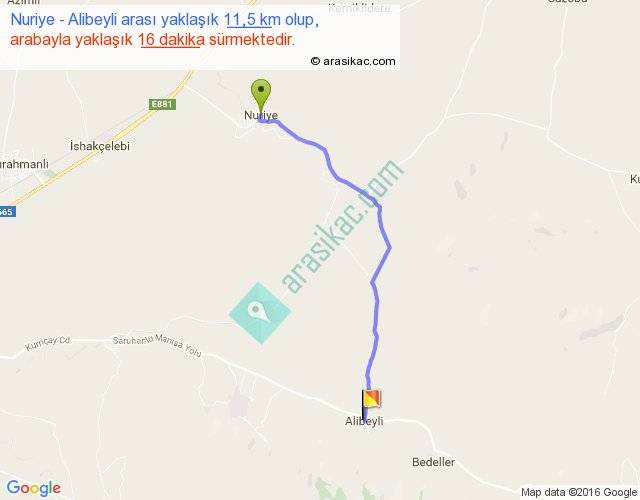 Nuriye - Alibeyli arası yaklaşık olarak 90 km/h ile yukarıda belirtilen sürede olup, iki yerin kuş uçuşu uzaklığı (mesafesi) 10'dir. Yolculuk otobüsle 20 dakika sürmektedir.