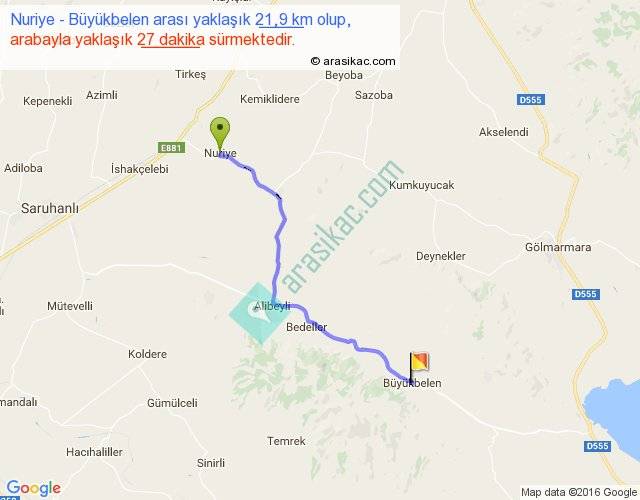 Nuriye - Büyükbelen arası yaklaşık olarak 90 km/h ile yukarıda belirtilen sürede olup, iki yerin kuş uçuşu uzaklığı (mesafesi) 18'dir. Yolculuk otobüsle 35 dakika sürmektedir.