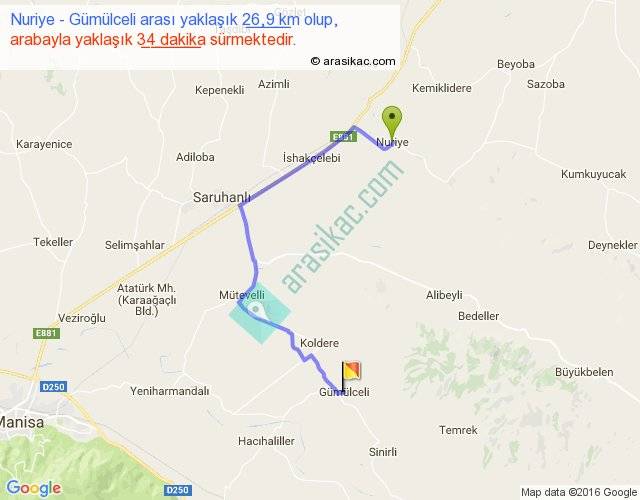 Nuriye - Gümülceli arası yaklaşık olarak 90 km/h ile yukarıda belirtilen sürede olup, iki yerin kuş uçuşu uzaklığı (mesafesi) 15'dir. Yolculuk otobüsle 44 dakika sürmektedir.