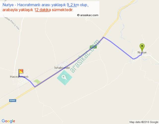 Nuriye - Hacırahmanlı arası yaklaşık olarak 90 km/h ile yukarıda belirtilen sürede olup, iki yerin kuş uçuşu uzaklığı (mesafesi) 7'dir. Yolculuk otobüsle 15 dakika sürmektedir.