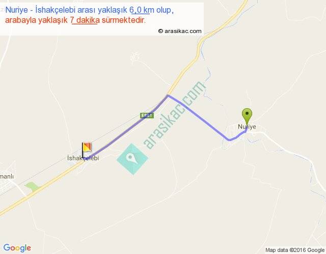 Nuriye - İshakçelebi arası yaklaşık olarak 90 km/h ile yukarıda belirtilen sürede olup, iki yerin kuş uçuşu uzaklığı (mesafesi) 5'dir. Yolculuk otobüsle 9 dakika sürmektedir.