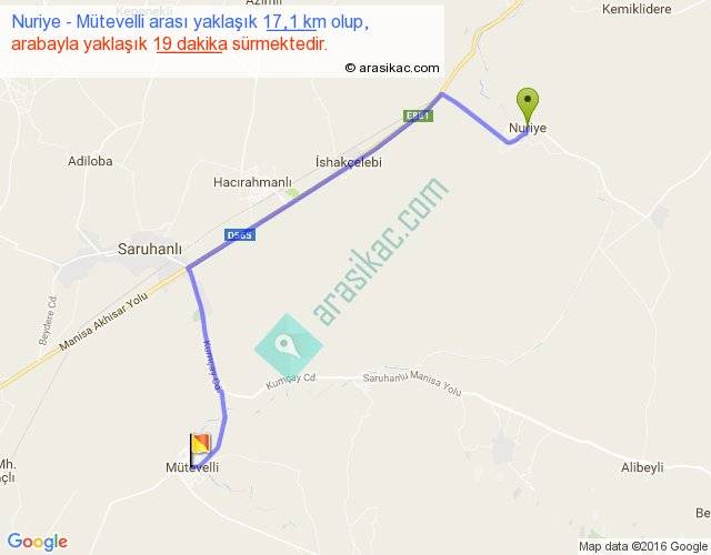 Nuriye - Mütevelli arası yaklaşık olarak 90 km/h ile yukarıda belirtilen sürede olup, iki yerin kuş uçuşu uzaklığı (mesafesi) 13'dir. Yolculuk otobüsle 24 dakika sürmektedir.