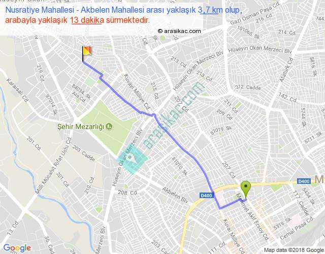 Nusratiye Mahallesi - Akbelen Mahallesi arası yaklaşık olarak 90 km/h ile yukarıda belirtilen sürede olup, iki yerin kuş uçuşu uzaklığı (mesafesi) 3'dir. Yolculuk otobüsle 16 dakika sürmektedir.