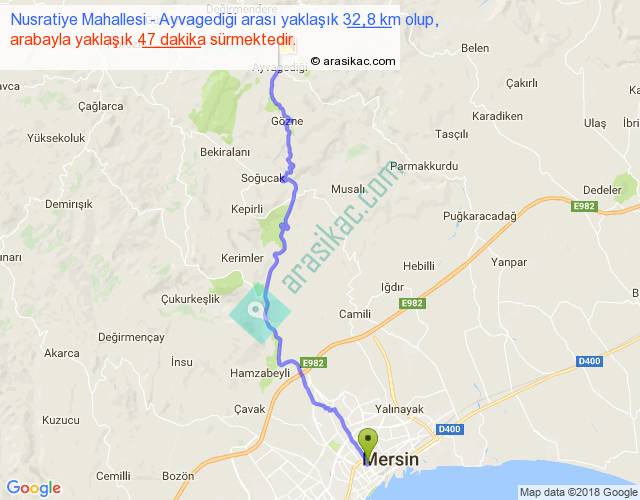 Nusratiye Mahallesi - Ayvagediği arası yaklaşık olarak 90 km/h ile yukarıda belirtilen sürede olup, iki yerin kuş uçuşu uzaklığı (mesafesi) 25'dir. Yolculuk otobüsle 1 saat 1 dakika sürmektedir.