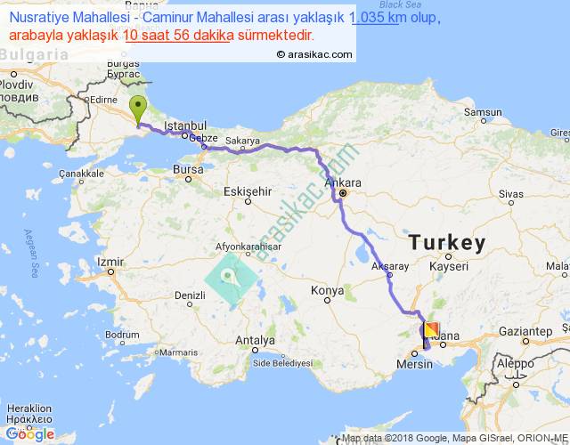 Nusratiye Mahallesi - Caminur Mahallesi arası yaklaşık olarak 90 km/h ile yukarıda belirtilen sürede olup, iki yerin kuş uçuşu uzaklığı (mesafesi) 767'dir. Eğer belirtilen yerler arasında uçak seferi var ise bu süre uçakla 1 saat 10 dakika'ya kadar düşebilir. Yolculuk otobüsle 14 saat 12 dakika sürmektedir.