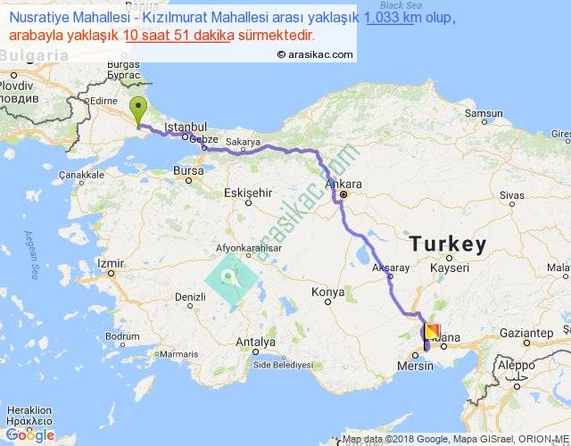 Nusratiye Mahallesi - Kızılmurat Mahallesi arası yaklaşık olarak 90 km/h ile yukarıda belirtilen sürede olup, iki yerin kuş uçuşu uzaklığı (mesafesi) 767'dir. Eğer belirtilen yerler arasında uçak seferi var ise bu süre uçakla 1 saat 10 dakika'ya kadar düşebilir. Yolculuk otobüsle 14 saat 6 dakika sürmektedir.