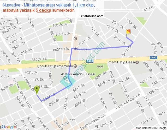 Nusratiye - Mithatpaşa arası yaklaşık olarak 90 km/h ile yukarıda belirtilen sürede olup, iki yerin kuş uçuşu uzaklığı (mesafesi) 1'dir. Yolculuk otobüsle 6 dakika sürmektedir.
