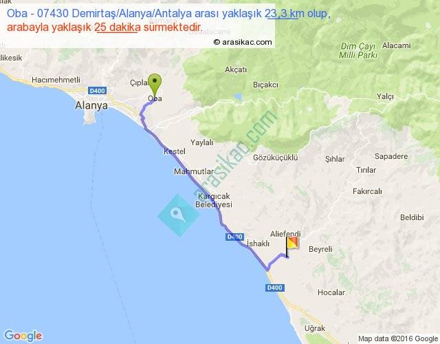 Oba - 07430 Demirtaş Alanya Antalya arası yaklaşık olarak 90 km/h ile yukarıda belirtilen sürede olup, iki yerin kuş uçuşu uzaklığı (mesafesi) 18'dir. Yolculuk otobüsle 32 dakika sürmektedir.