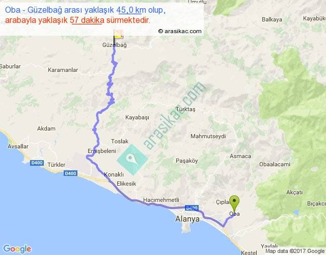 Oba - Güzelbağ arası yaklaşık olarak 90 km/h ile yukarıda belirtilen sürede olup, iki yerin kuş uçuşu uzaklığı (mesafesi) 25'dir. Yolculuk otobüsle 1 saat 14 dakika sürmektedir.