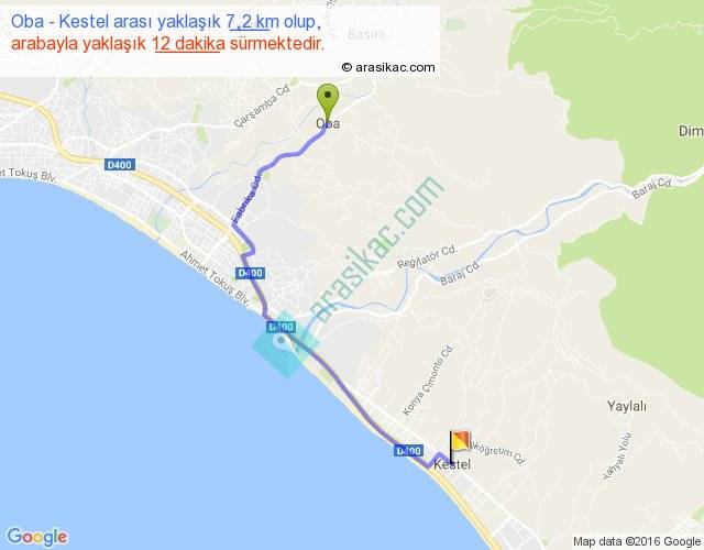 Oba - Kestel arası yaklaşık olarak 90 km/h ile yukarıda belirtilen sürede olup, iki yerin kuş uçuşu uzaklığı (mesafesi) 5'dir. Yolculuk otobüsle 15 dakika sürmektedir.